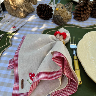Entre os destaques da coleção, você encontrará toalhas de mesa elegantes e peças bordadas à mão, que são verdadeiras obras de arte. Cada toalha apresenta um delicado bordado de cogumelo na ponta, que também se repete nos nossos guardanapos de linho e porta-copos. Esses detalhes encantadores não apenas embelezam a sua mesa, mas também trazem um toque de aconchego e originalidade às suas reuniões familiares.